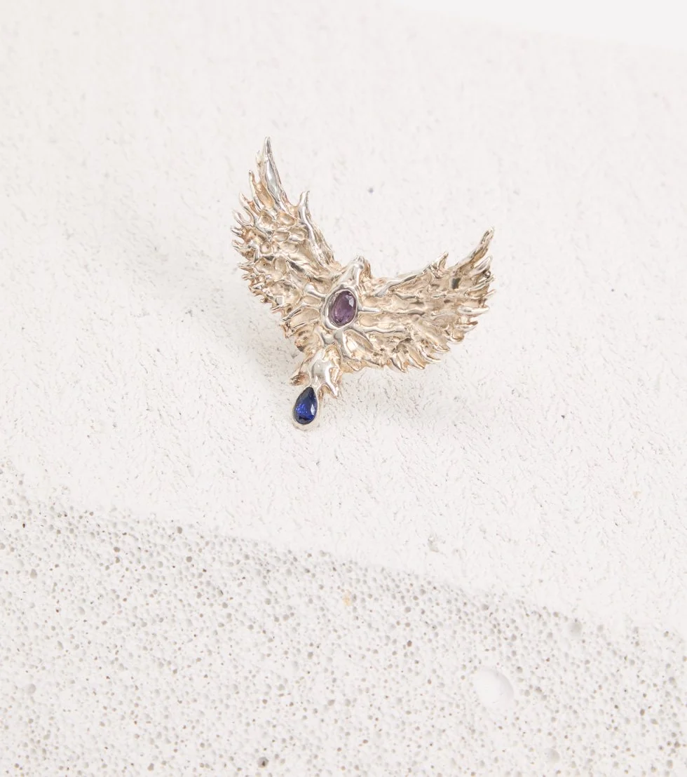 The work embodies escapism from an uncertain present, designed to be worn by everyone - from goths to bimbos, priests to misfits. All pieces are locally made from responsibly sourced 925 Sterling Silver.